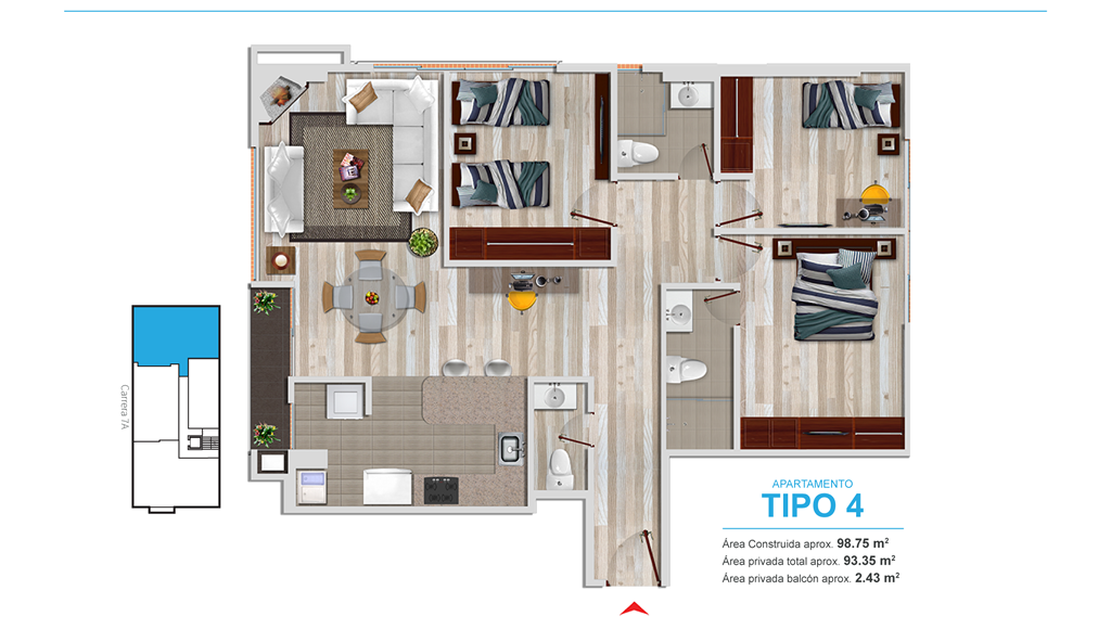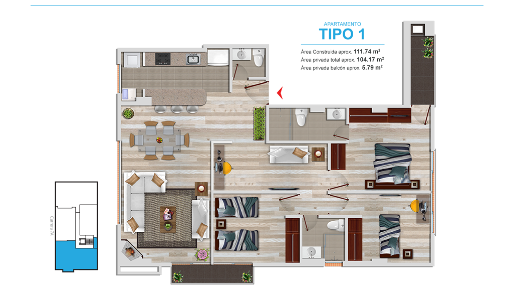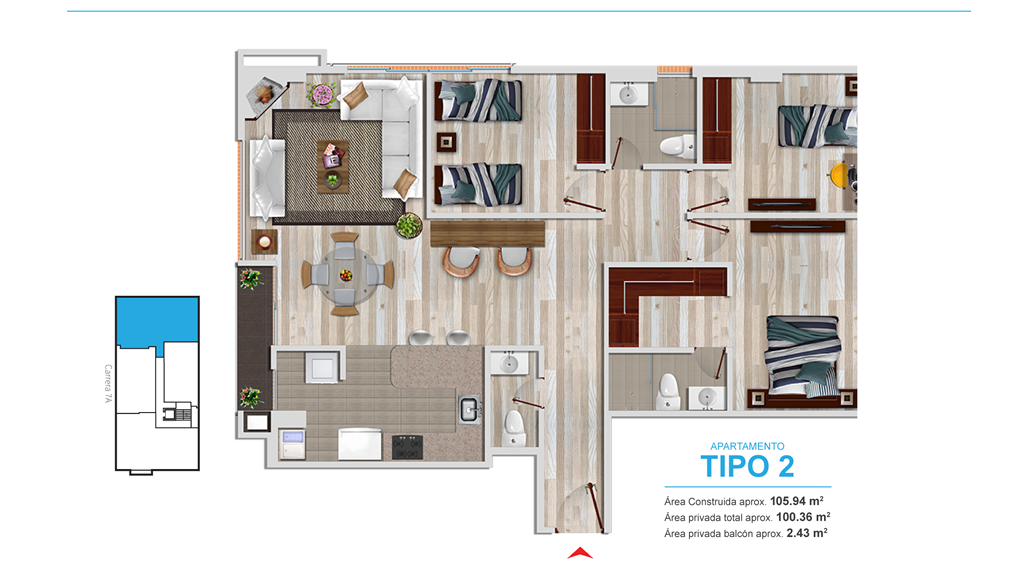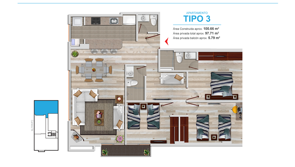 - Ventanería en aluminio, de piso a techo en alcobas y zonas sociales, con perfilería de tipo pesado y cristal laminado para mayor seguridad y aislamiento térmico y acústico.